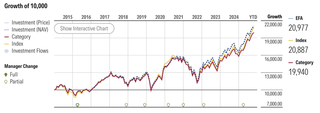 | EFA | Europa, Asia, Oceanía | Desarrollados | 0.32% | 8.1% anual | 14.7% |