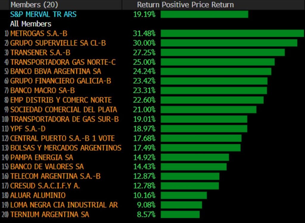 Como siempre, solo inviertan en ETF’s, Argentina es una economía muy pequeña e inestable para invertir en sus mercado. Como muestra la siguiente tabla, todas las acciones del índice han subido.