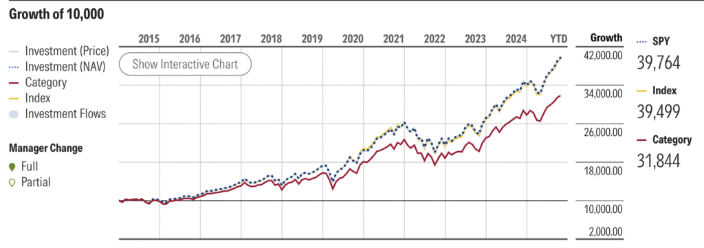 - SPY (indexado): $10,000 invertidos hace 10 años se convirtieron en $39,499