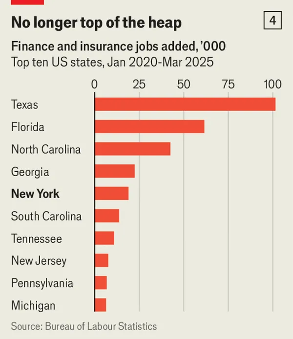 For more than two centuries, New York has been the nation’s financial center, but this pre-eminence is slipping. The share of workers employed in finance and insurance has fallen from 11.5% in 1990 to 7.7% in August 2025. Of the 233,000 finance jobs created in America over the past five years, New York secured only around 19,000—behind Texas, Florida, North Carolina, and Georgia. Financial firms are cutting costs by relocating to cheaper cities: Goldman Sachs has nudged managers to Dallas and Salt Lake City, Morgan Stanley is now the largest employer in Alpharetta, Georgia, and Citigroup is expanding in Charlotte, North Carolina.